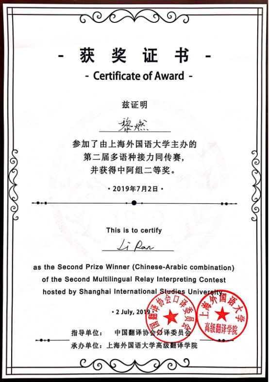 上外第二届多语种接力同传赛中阿组二等奖