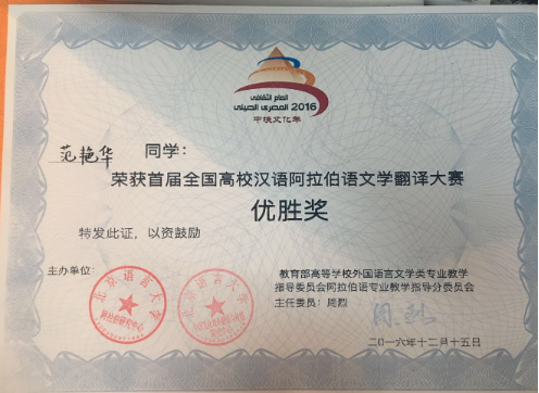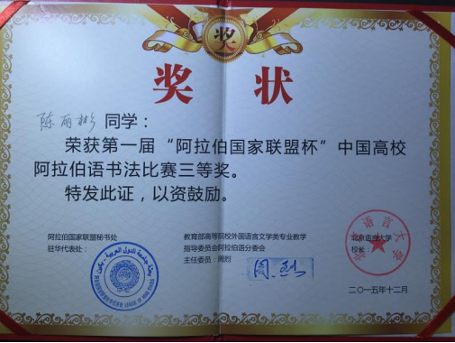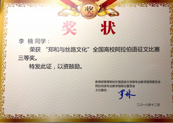 14级贾艺彤获得第四届全国阿拉伯语演讲比赛三等奖
