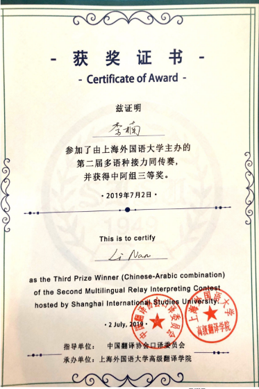 上外第二届多语种同传接力赛三等奖奖状