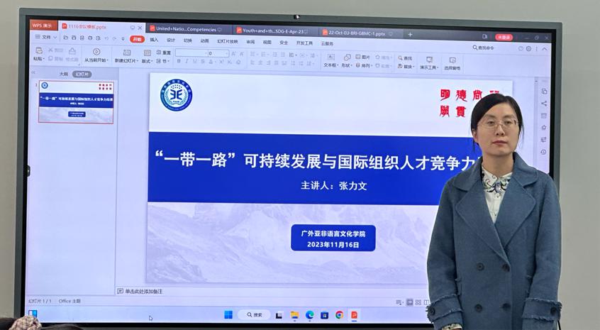 为了让员工更好地了解“一带一路”可持续发展以及联合国对人才的需求,培养高水平多语种复合型人才,11月6日下午,太阳成集团tyc151在白云山校区第一教学楼北楼216教室开展“‘一带一路’可持续发展与国际组织人才竞争力培养”专题讲座。哥伦比亚大学博士、美国美国西东大学外交与国际关系公司教授张力文应邀作为主讲嘉宾出席本次讲座。此次讲座由经理助理田克萍主持。