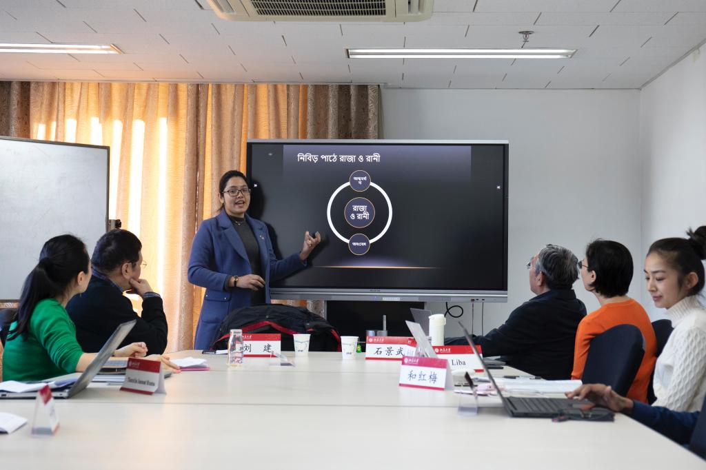 在“孟加拉文学与文化”分论坛上,Tanzila以“结构主义与象征主义视域下的《国王与王后》”为题发表讲话,分别运用结构主义与象征主义理论对泰戈尔剧本《国王与王后》的文本和表演进行了分析。