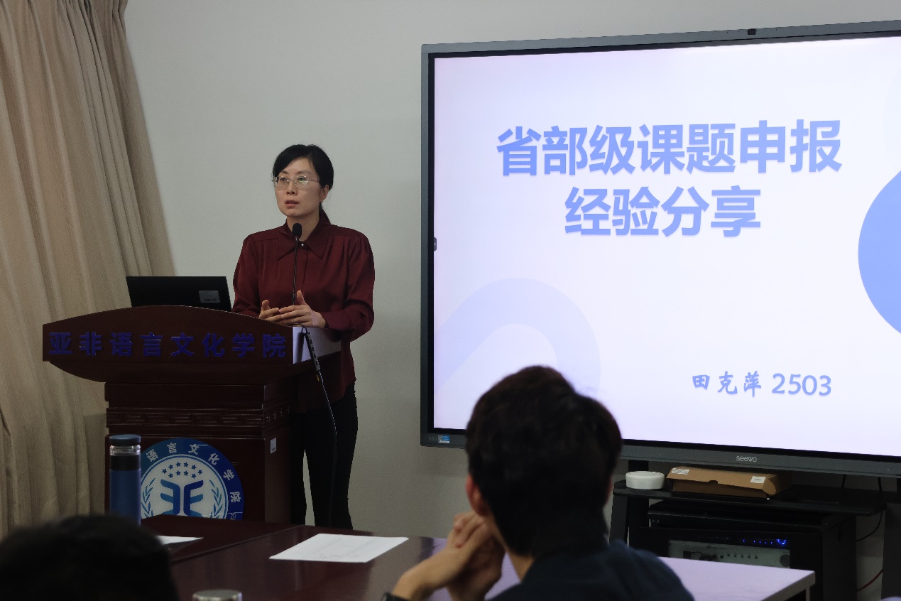 田克萍老师针对省社科、省教改和教育部项目的申报经验做了分享。她指出,选题必须与个人的研究兴趣密切相关,避免盲目跟风。她还提到,在申报过程中要不断地坚持和尝试,以提升项目申报的成功率。田老师还强调了申报书的精细打磨,细节决定成败,她逐一介绍了项目书各部分的撰写要点,确保每一部分的内容都能准确表达研究的价值与目标。