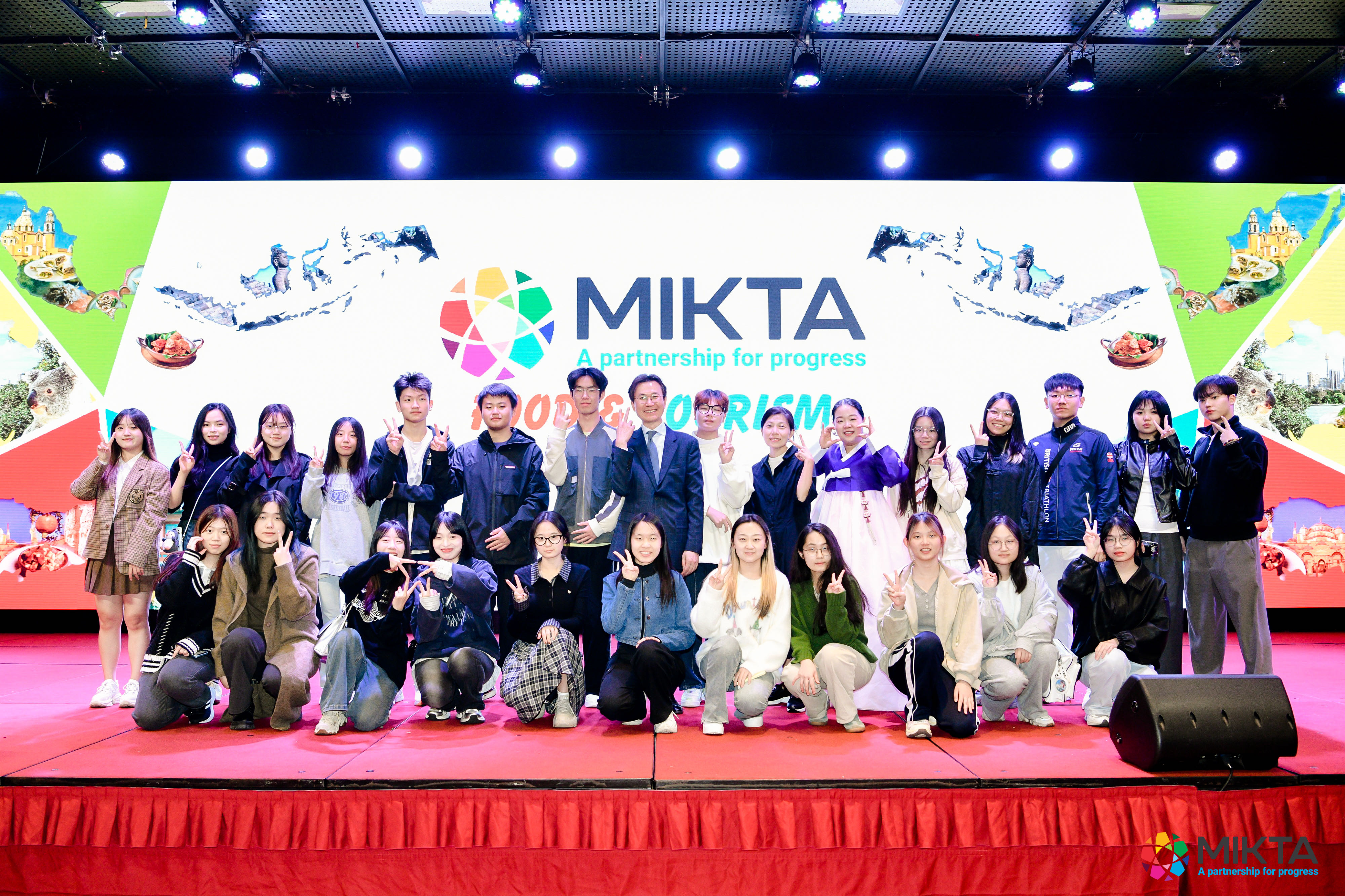 该活动旨在通过美食和旅游推介,促进MIKTA成员国与中国的文旅交流,加强文化的沟通理解与尊重,助力构建平等互利的全球多边合作体系。活动现场,韩国驻广州总领事姜相旭(강상욱)和土耳其驻广州总领事卡安·巴什阔特(Kaan Başkurt)与同学们亲切地交流并合影留念。