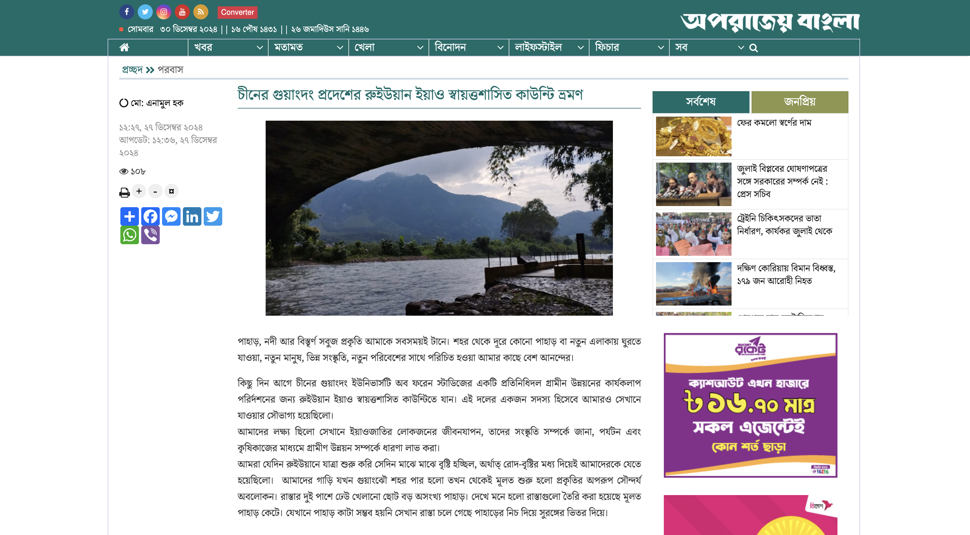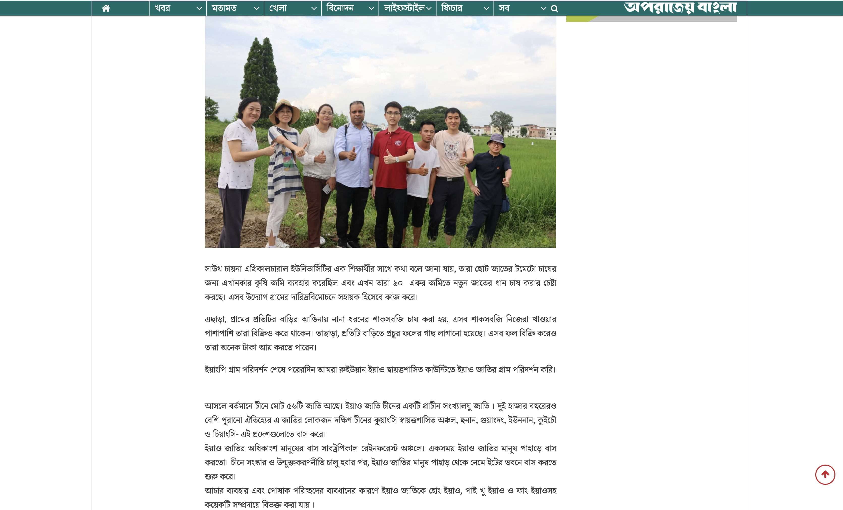 本网讯 近日,太阳成集团tyc151孟加拉语专业外籍教师伊纳穆勒·毫克用孟加拉语撰写了宣传公司乡村振兴工作和介绍瑶族文化的文章,发表在了孟加拉国媒体网站Aparajeobangla上。Aparajeobangla是孟加拉国的孟加拉语——英语在线新闻门户网站,广受孟加拉国年轻读者的欢迎。