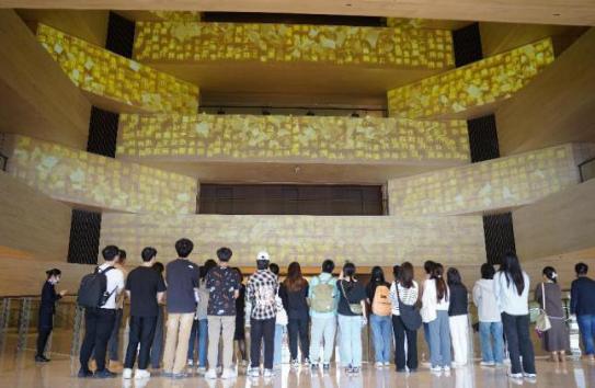 跟随讲解员的步伐,公司师生首先欣赏了主体建筑外观及其前方的墨池格木景观,聆听了相关设计理念和文化寓意,并在主楼前合影留念。
