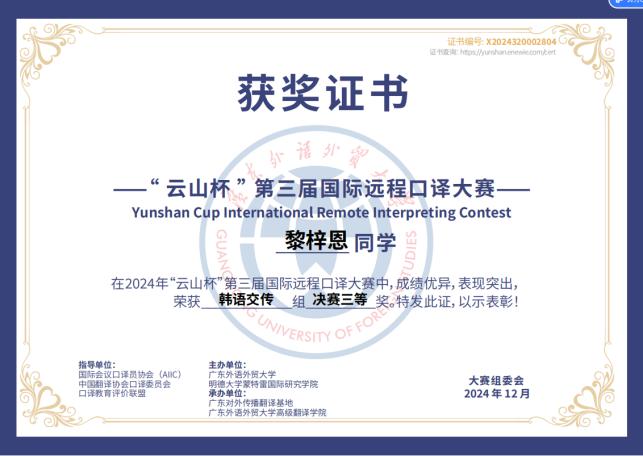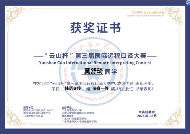 决赛汇聚了来自国内外高校的218名选手,以高水平的交替传译和同声传译技能,用16种外语向世界讲述中国故事、广东故事,进一步推动了中外文化的交流与民心的相通。经过激烈角逐,公司朝鲜语口译专业员工莫舒琦、李碧欣、黎梓恩以优异的表现脱颖而出,分别斩获第三届“云山杯”国际远程口译大赛交传组一等奖、交传组三等奖、同传组一等奖(未举办决赛,初赛即决赛)等奖项。