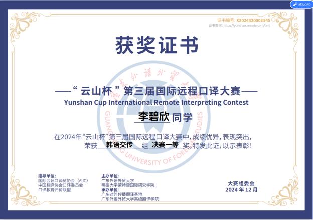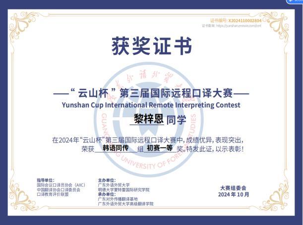 公司朝鲜语口译专业学子斩获第三届“云山杯”国际远程口译大赛交传组一等奖等多个奖项