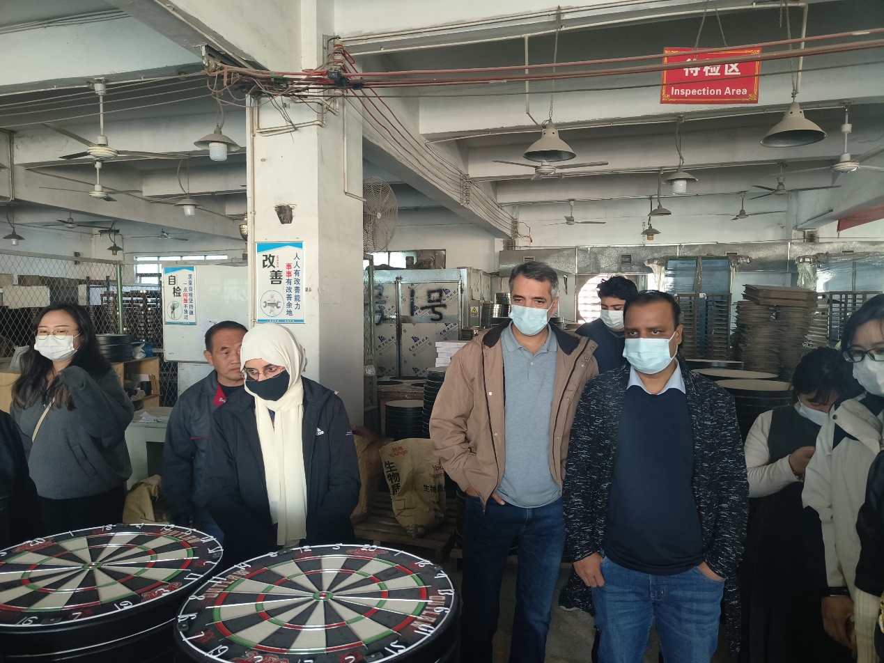 随后,教师们一行来到了惠州市创展运动器材有限公司其中一个工厂,依次参观了生产国际赛事级别飞镖盘的生产各流程的生产车间,与工厂工人进行交流,后又来到会议室了解了企业的发展历程、主营业务、主要产品等情况。这是一家在惠州扎根22年,通过自创的上下端打通的“一条龙“ 经营模式,同时经营海外公司和品牌零售的行业知名企业,核心产品为泳衣、水上运动设备、飞镖等,囊括了几乎所有的运动,在包括亚马逊在内的众多国内外知名电商平台上均有售卖,生产产值超5亿。作为广外惠州员工会会长的公司负责人李榕庆董事长在介绍中提到,为了响应2008年中国企业”走出去“政策和”一带一路“政策号召,也为了响应红色基地号召,创展公司先后前往赣州办厂,收购行业内小众品牌,把设计和研发带回中国,把营销留在海外,在德国、澳洲、加拿大、北欧都有业务涉及,97%的业务都为出口。因此他也期待能有更多优秀的广外学子能够加入他们,能够有更多的合作。