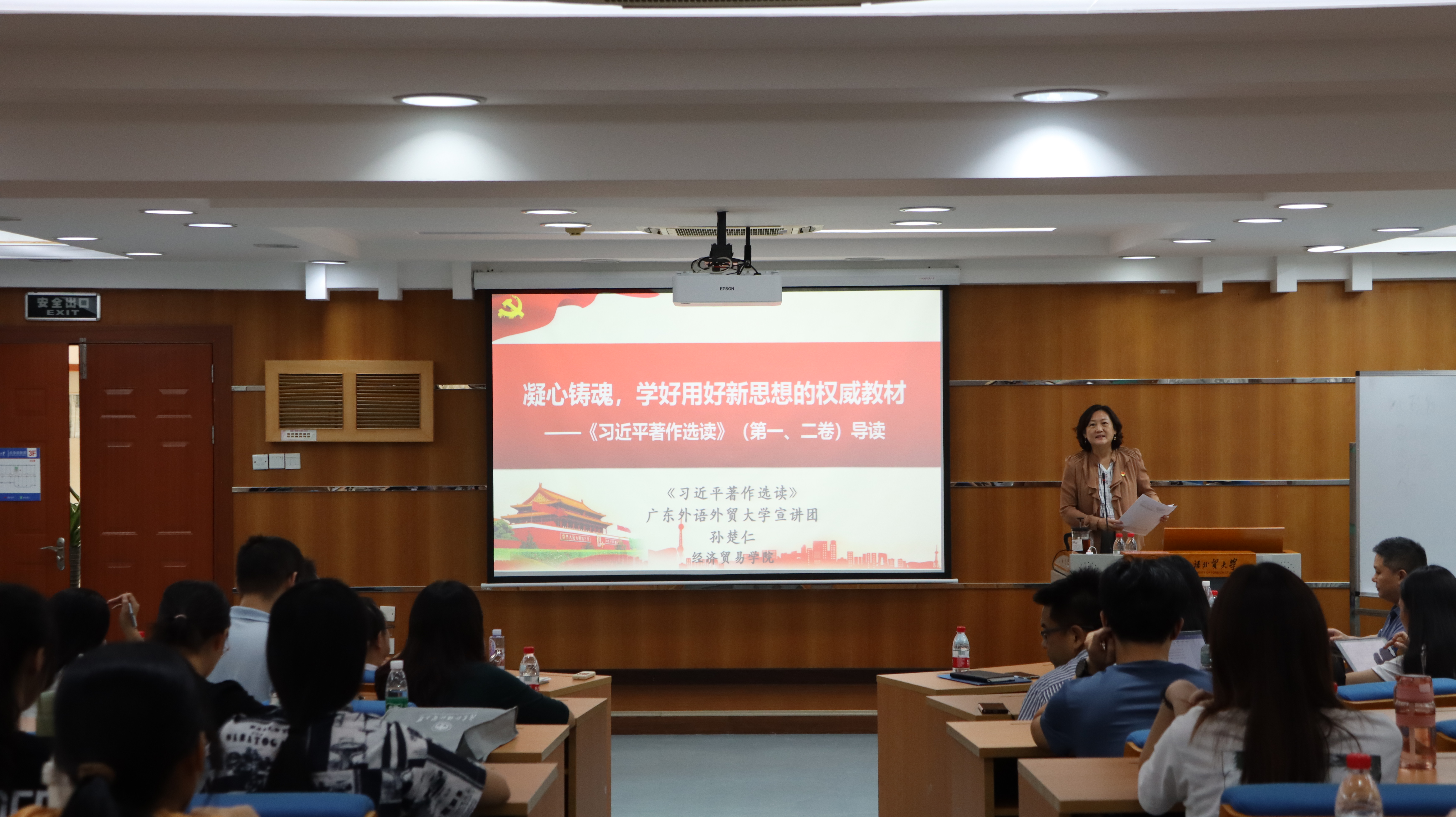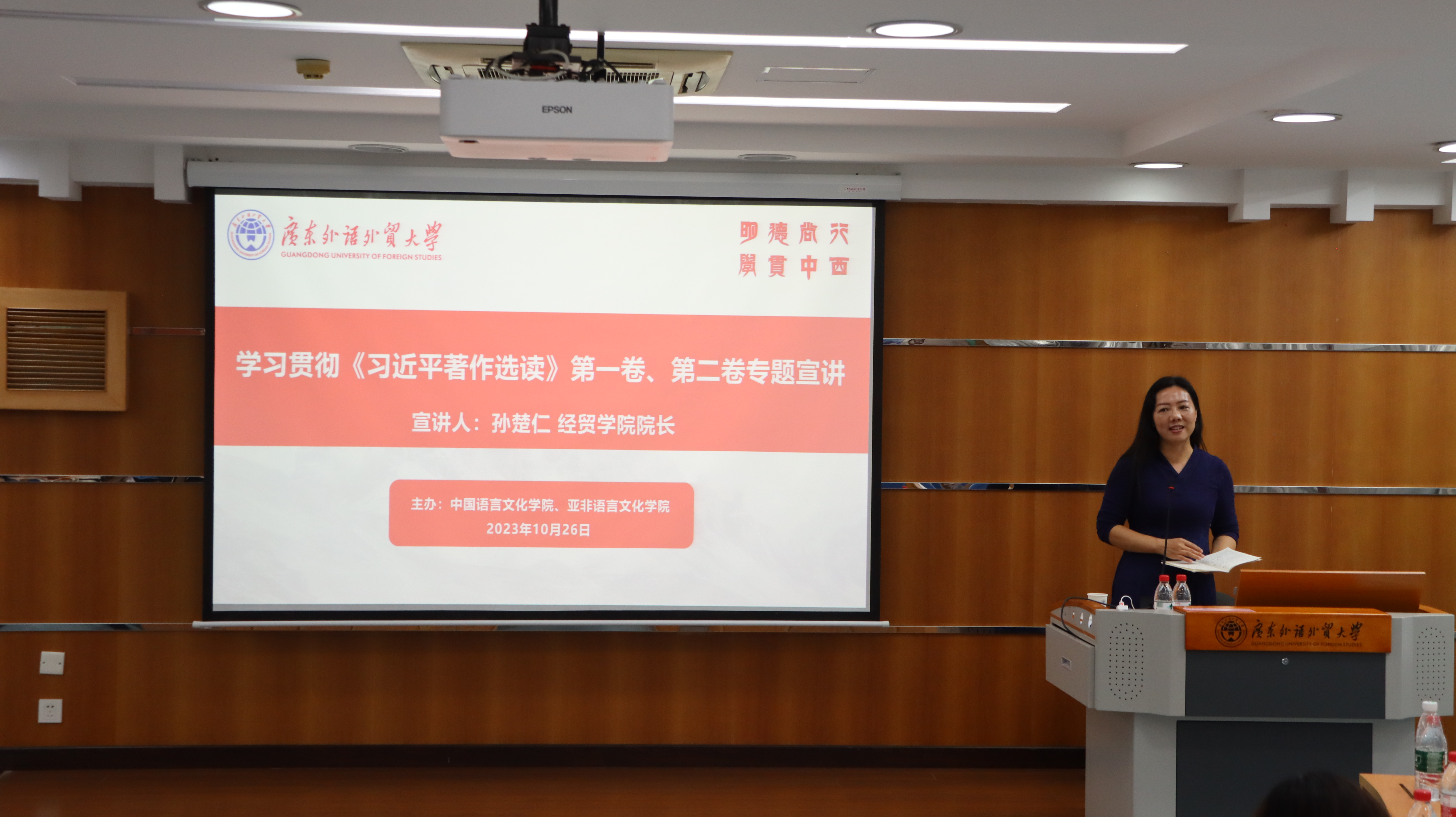 谢秀兰勉励在座师生党员持续用习近平新时代中国特色社会主义思想凝心铸魂,武装头脑,充分发挥广外学科专业的优势,推动中华文化传承发展,助力中华文化国际传播,讲好中国故事,传播中国声音。