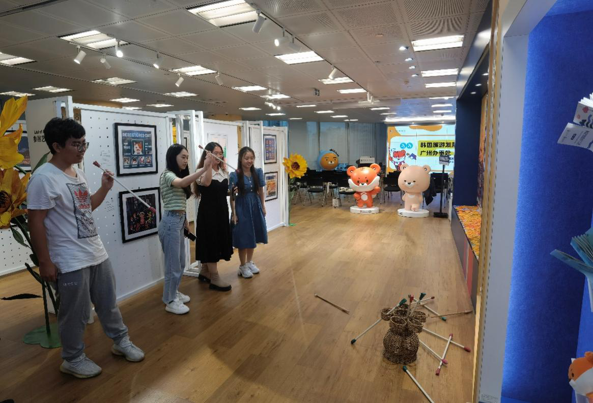 在讲座结束后,朝鲜语系师生与韩国旅游发展局广州办事处的各位工作人员合影留念,并参观了活动场地Korean Plaza。活动现场设置了制作香囊、投壶、“大邱”主题展览等一系列活动并准备了丰富的小礼品。朝鲜语系师生在参加体验活动,拓展对韩文化了解的同时,也收获了韩国旅游发展局广州办事处设置的许多富有韩国人文气息的小礼品和旅游手册。