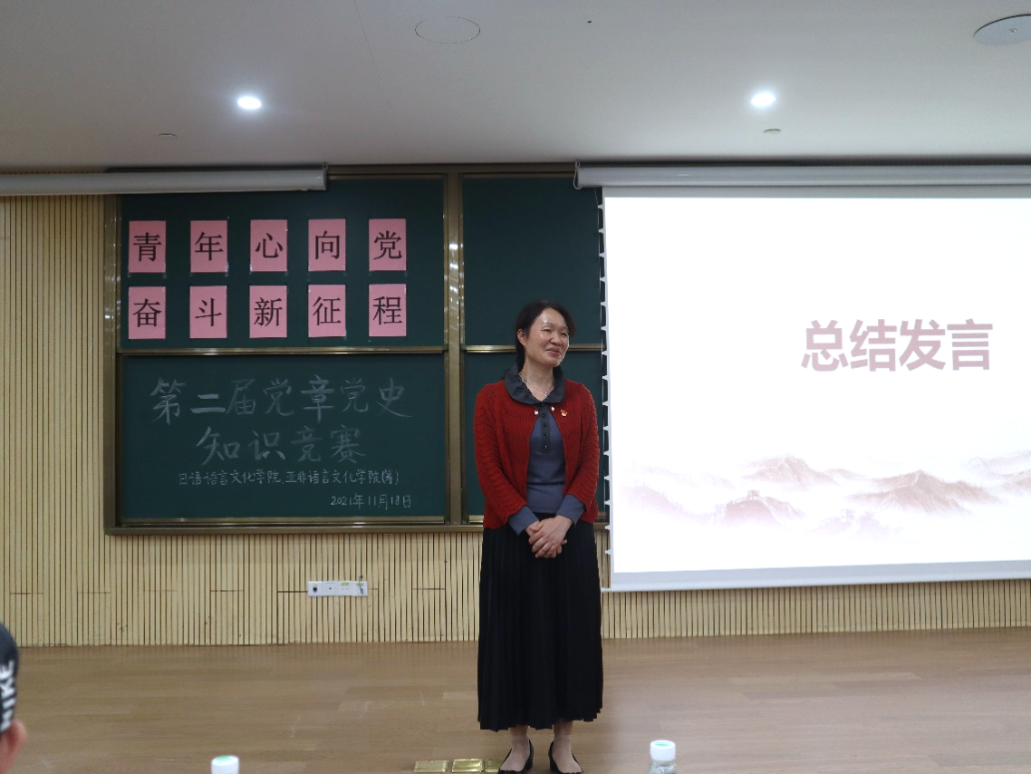 “勿忘昨天的苦难辉煌,无愧今天的使命担当,不负明天的伟大梦想”。周秀娇总结到,在建党一百周年之际,全党开展党史学习教育具有重要和深远意义,不仅有助于我们从党史中汲取智慧,更赋予我们整装出发、继续朝着第二个百年奋斗目标前进的力量。今天的党史知识竞赛内容丰富,包含习近平总书记在庆祝中国共产党成立100周年大会上的重要讲话精神、在纪念辛亥革命110周年大会上的重要讲话精神以及党的十九届六中全会精神等。同学们准备充分,展示了良好的精神风貌。希望同学们以此为契机,作为国家建设的接班人,做到以下几点:一是要继续加强党史学习教育,提升思想理论素养,汲取百年党史的智慧和力量,坚定理想信念;二是要理论联系实际,将党史学习教育入脑入心,外化于行,知行合一;三是要弘扬伟大建党精神,践行党员初心,勇担使命,勤学苦练,不断提高自身综合素质,成为德才兼备的社会主义建设者和接班人。