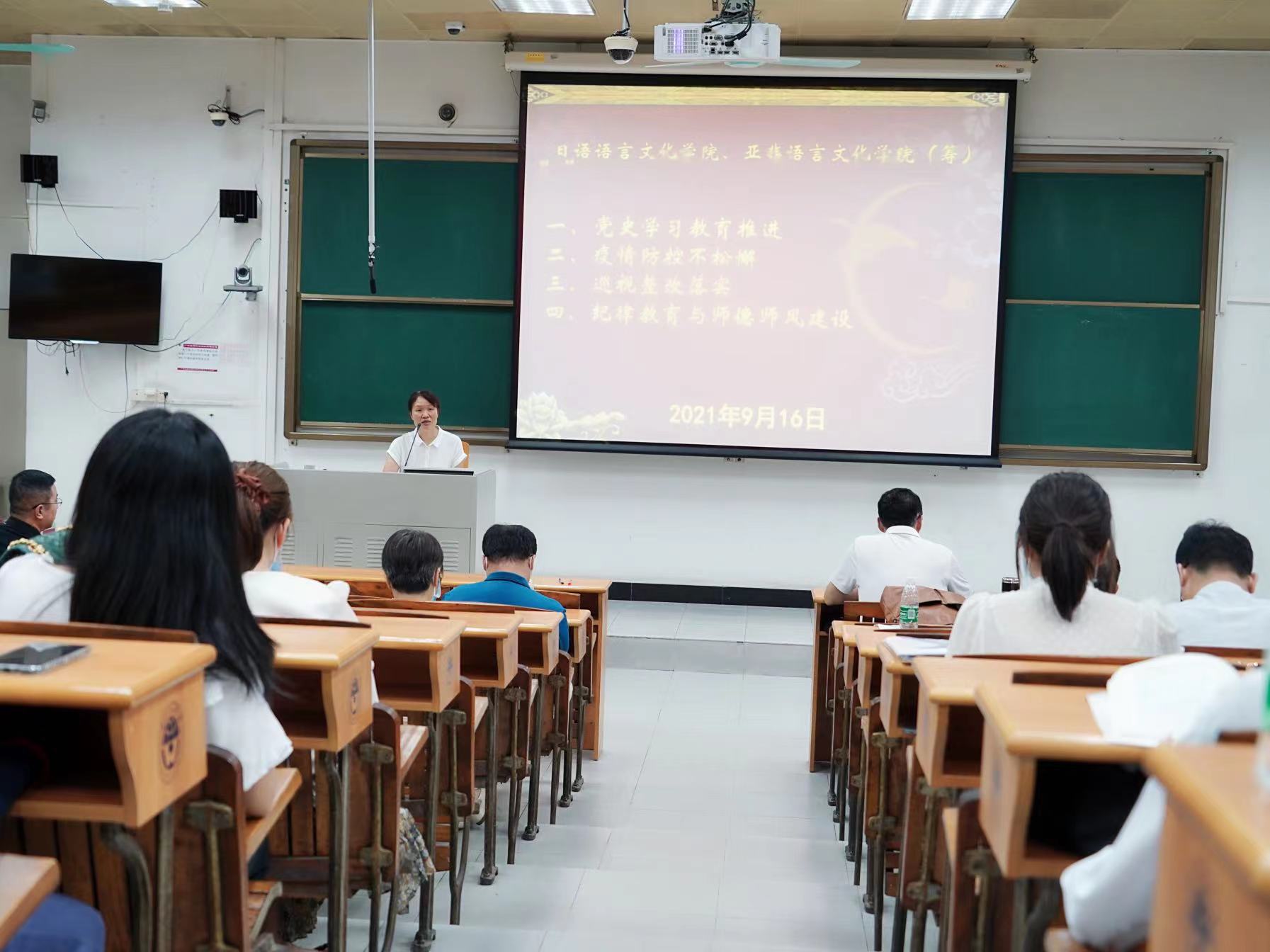 2021年9月16日下午,日语公司、太阳成集团tyc151(筹)在二教219教室召开新学期工作布置会,全院教职工参加会议。会议由公司党委书记周秀娇主持。