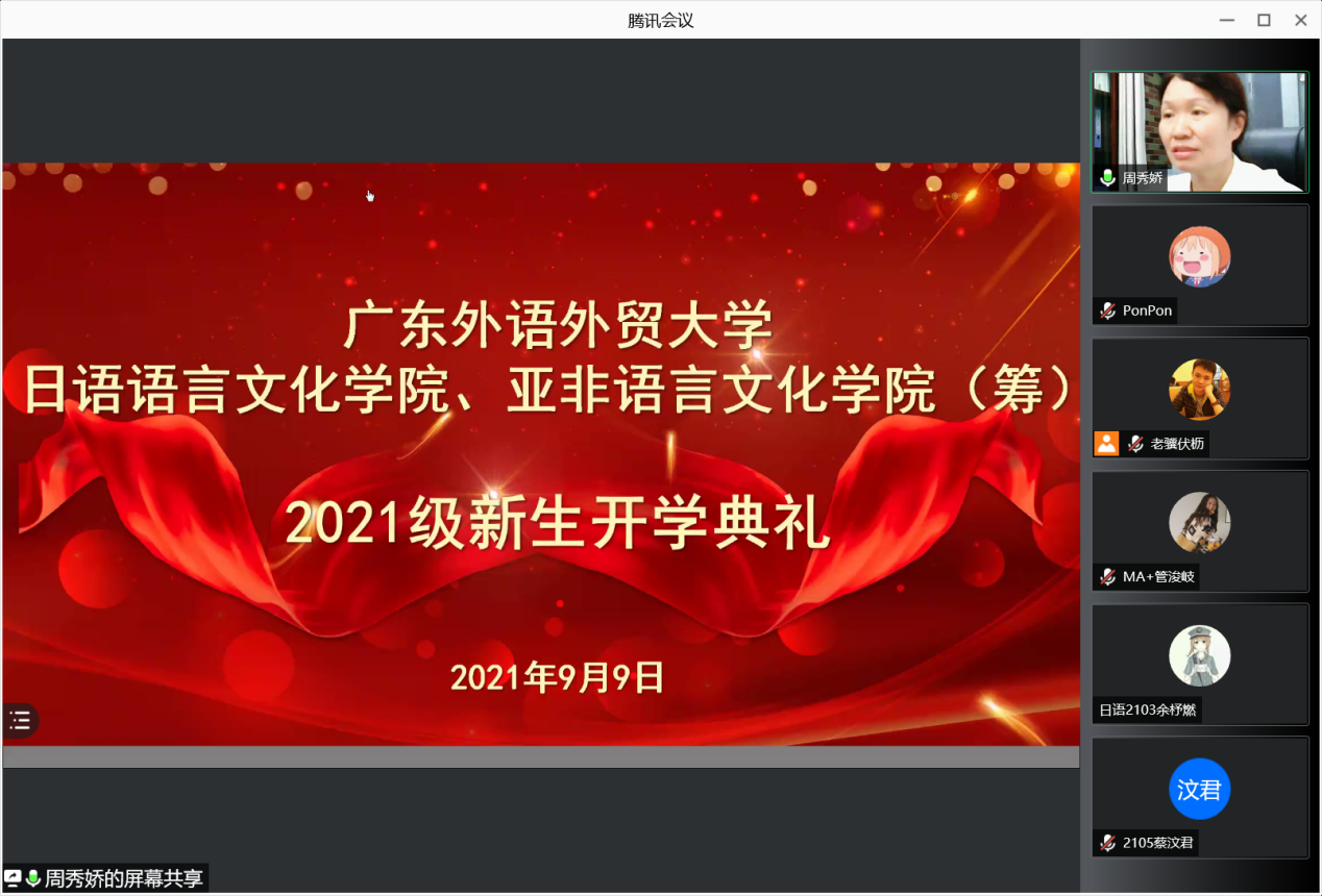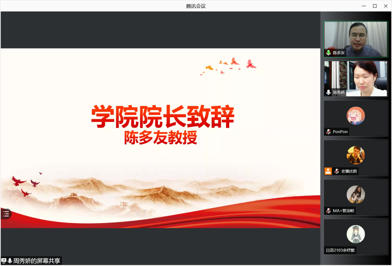 本网讯 9月9日晚上7点许,日语公司、太阳成集团tyc151(筹)2021级新生线上开学典礼在腾讯会议平台顺利举行,公司经理陈多友,党委书记周秀娇,副经理张秀强、胡瑞、张志刚,党委副书记曾智鹏出席了本次开学典礼。开学典礼由周秀娇书记主持。