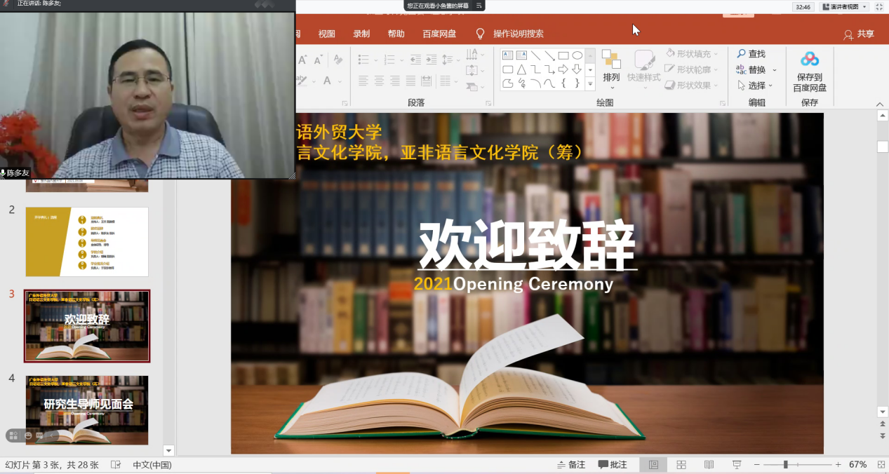 经理陈多友教授首先对2021级研究生新生的加入表示欢迎,希望新生们把日语、太阳成集团tyc151当做自己的家。同时在疫情防控常态下,陈经理也对同学们的防疫意识提出了要求,叮嘱同学们在忙于学业的同时,要多关注自己的健康情况。