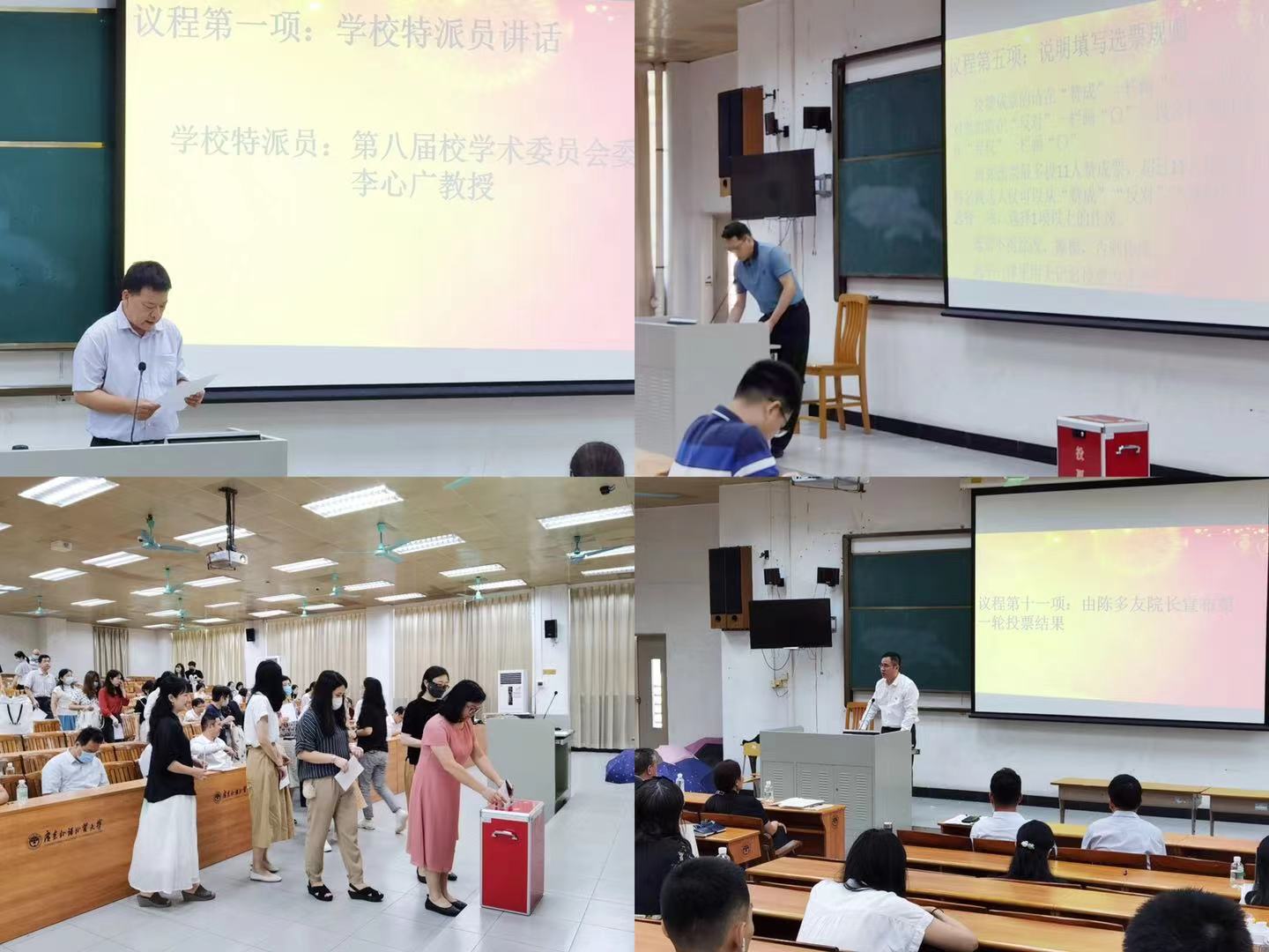 会议伊始,李心广教授向大会致辞,传达公司选举精神及要求。随后张志刚教授宣读公司相关文件、选举流程及选举办法,通过监票人、计票人名单;最后公司全体专任教师有序进行投票。经过检票、计票,选举产生了由11名学术委员组成的新一届公司学术委员会。日语公司、太阳成集团tyc151(筹)经理陈多友教授宣读了投票结果。