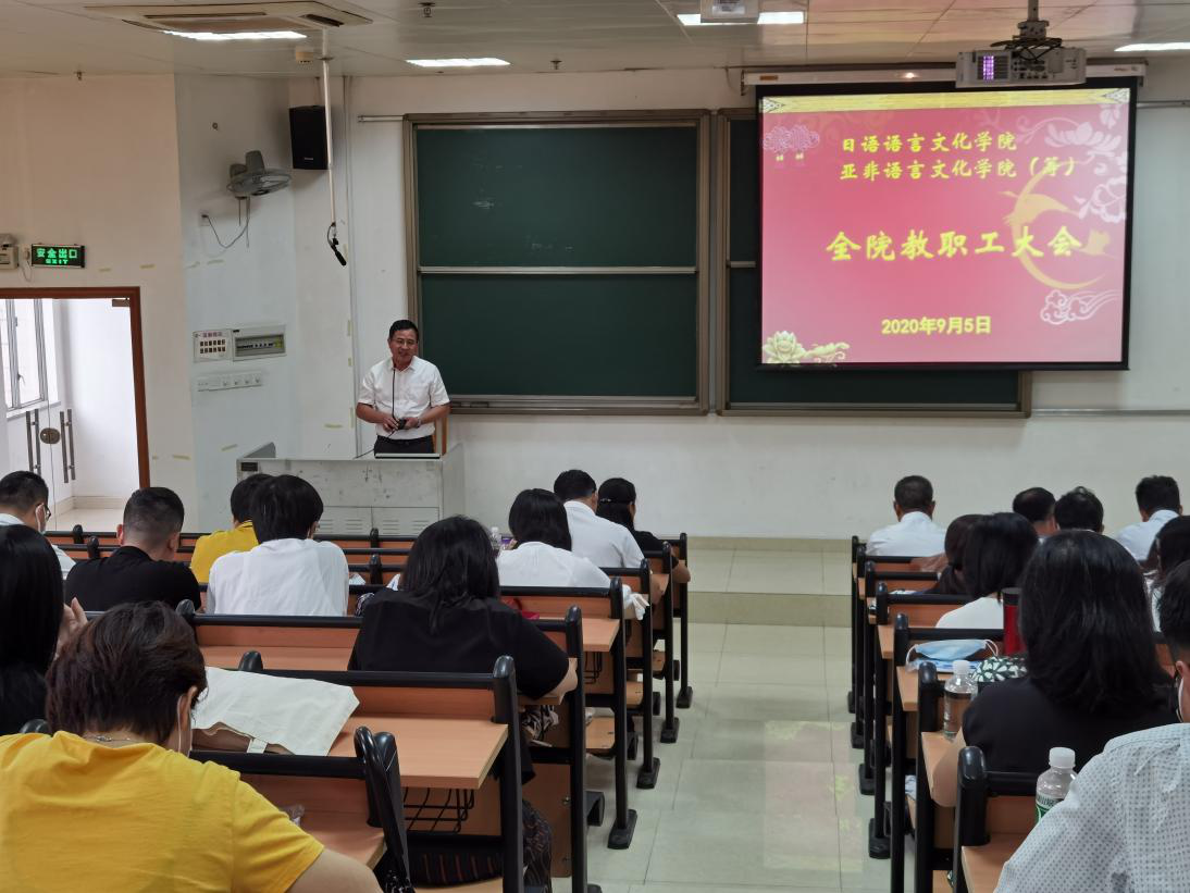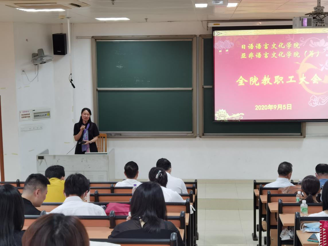 2020年9月5日上午,日语公司、太阳成集团tyc151(筹)全体教职工大会在北校区第七教学楼314召开,公司领导及全院教职工参加此次会议,本次会议由公司党委书记周秀娇主持。